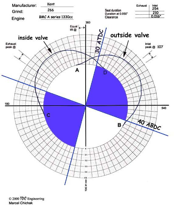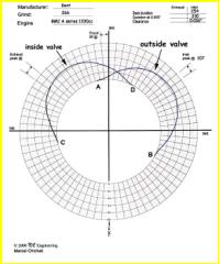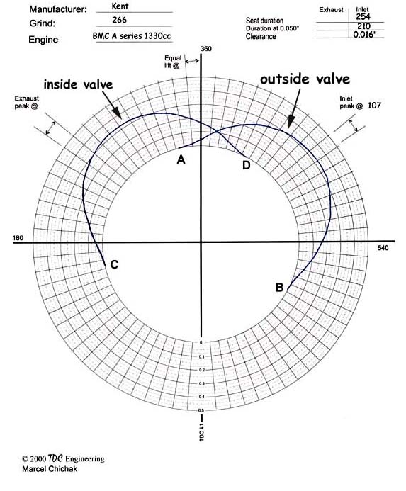 Let’s look at the firing order on these engines: 1-3-4-2 or, because it is cyclic it can be presented as 2-1 3-4. Look carefully at that grouping: the cylinders that share the inlet port fire after each other and they do so with the inside cylinder, 2 or 3, leading the outside cylinder 1 or 4. Now, stand in the 1-2 inlet port and watch what goes on as the engine runs. What the port sees is (in strokes): suck, suck, wait, wait. This is best shown on the polar graph I use for setting up camshafts on my engines. Instead of inlet and exhaust for # 1 cylinder, I’ve plotted the inlet valve motion for the outside and inside cylinders together. The timing is for a Kent 266 cam with standard 1.37:1 pressed steel rockers.