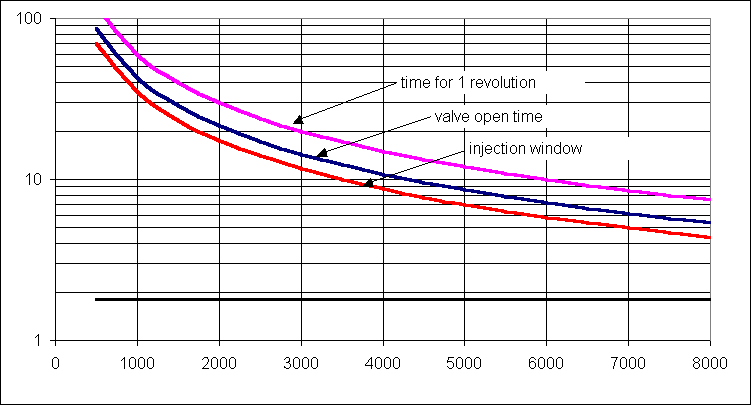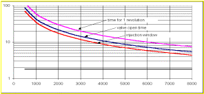 Dyno testing will be needed to confirm both the 30° ATDC and 58% figures. Maybe the travel time from the injector tips to the cylinder is longer than I guessed and the injector can be fired earlier thereby making the window bigger and necessitating a smaller injector. Maybe shutting the injector off as the valve is closing is too late? Only testing and checking the oxygen sensors will tell.