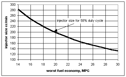 CHECK: The 5.7 L V8 Corvette uses eight 219-230 cc/min injectors. That’s an equivalent of a 2.8 L 4 cylinder roughly double our 1.3 L . Since we are using 2 injectors to feed the whole engine instead of 4, that’s about the same as a 1.4 litre. QED